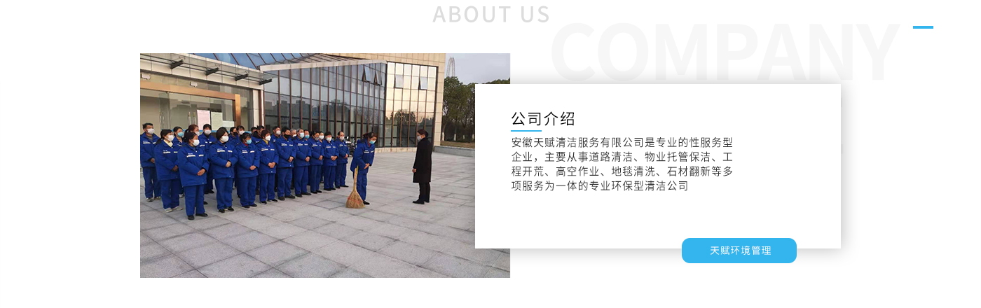安徽天賦清潔服務(wù)有限公司是的服務(wù)型企業(yè),主要從事道路清潔、物業(yè)托管保潔、工程開荒、高空作業(yè)、地毯清洗、石材翻新等多項服務(wù)為一體的環(huán)保型清潔公司。公司管理機(jī)制完善,清潔作業(yè)經(jīng)驗豐富,擁有技術(shù)力量,嚴(yán)格實行崗前培訓(xùn)—崗中督查—上崗在培訓(xùn)的員工管理措施,憑著優(yōu)良的清潔質(zhì)量和嚴(yán)格的督查管理,為眾多企事業(yè)單位、醫(yī)院、酒店、廠區(qū)商場、物業(yè)、道路、學(xué)校、公園等提供后勤清潔服務(wù)。在業(yè)內(nèi)擁有良好的口碑。工作人員,服務(wù)態(tài)度優(yōu),竭力為客戶提供好的保潔服務(wù)。安徽天賦清潔服務(wù)有限公司:致力于長期合作關(guān)系,提高服務(wù)質(zhì)量,提供高標(biāo)準(zhǔn)的清潔服務(wù)。公司的經(jīng)營理念:為營造一個更清潔、亮麗的生活和工作環(huán)境而努力!“誠信”是公司成功保證。“客戶至上,信譽為首”是公司宗旨。高標(biāo)準(zhǔn)提供服務(wù),維護(hù)客戶利益、形象,是我始終不渝的目標(biāo)。